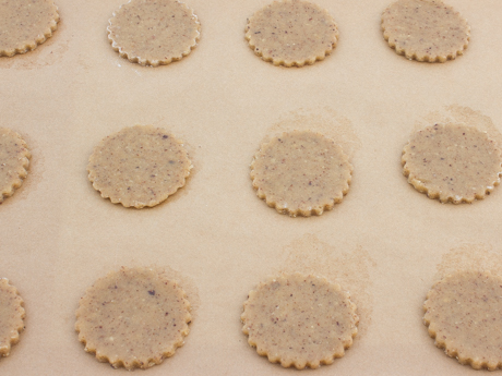 Roll chilled dough between two sheets of parchment to ⅛ inch (3 millimetres) thickness. If dough is difficult to roll, let rest for 10 minutes (to soften). Using a 2 ½ inch (6.5 centimetre) round cutter, cut 18 rounds and place them 1 ½ inches (3.25 centimetres) apart onto one of the prepared baking sheets.