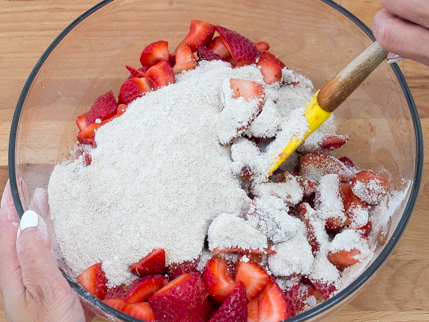 In a large bowl, toss together the quartered strawberries, lemon juice, and lemon zest. Pour sugar-mixture over the berries, toss until strawberries are well coated.