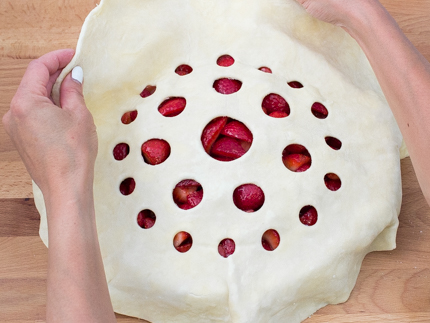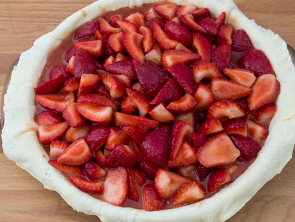Transfer the strawberries into the prepared pie crust, mounding the berries in the middle. Carefully drape the top crust over the strawberries.