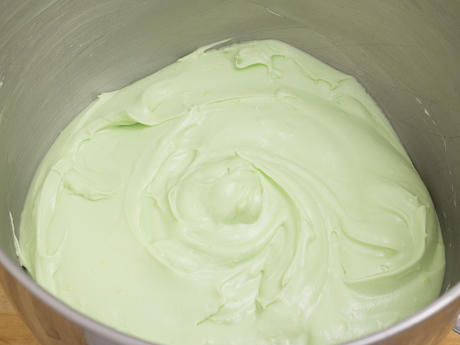 3. Add lemon juice, lemon zest, and vanilla extract, and blend until creamy and fluffy. Add food colouring, and, if needed, the heavy cream. Cream the mixture until the food colouring is evenly distributed throughout the buttercream.