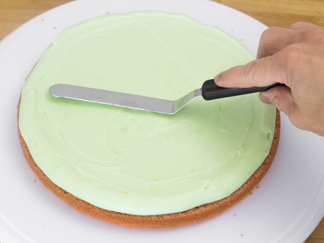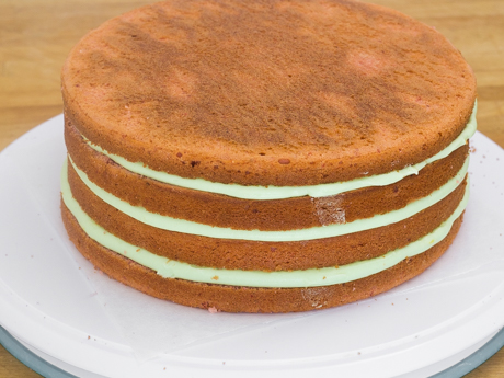 1. With a sharp serrated knife, carefully slice off the rounded tops of the completely cooled cakes. If available, place cake onto a cake turntable. With the knife held parallel to the work surface, carefully and evenly divide the cake in half while turning the cake on the turntable. Repeat process with the second cake.