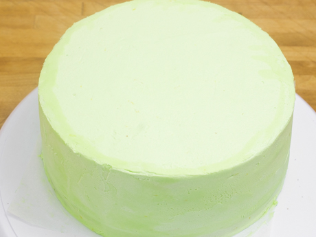 4. With the entire cake assembled, spread a thin coat of buttercream over the top and the sides to seal in the crumbs; this is called a crumb coat. Place into the fridge to set the crumb coat; about 15 minutes or until buttercream is firm to the touch.