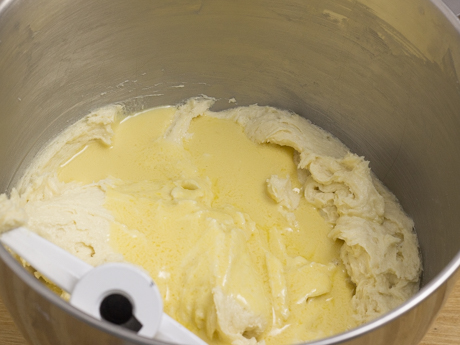 6. Add half of the egg mixture, mixing until fully incorporated before adding the rest of the egg mixture. Before the egg mixture is fully mixed, add the strawberry puree. Mix until batter is thoroughly combined; do not overmix.