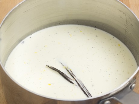 - In a medium heavy saucepan combine 1 ¼ cup (300 ml) heavy cream, milk, ½ cup (100 g) Redpath ® Granulated Sugar, lemon zest, vanilla seeds and vanilla pod. Over medium heat bring to barely steaming, then remove from heat, cover and set aside for 20 minutes to steep.