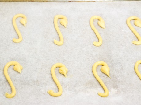 - Following the S shapes on the parchment, pipe 8 necks with the plain pastry tip. On one end of each neck pipe a …œ inch (1 centimeter) circle, pulling downwards to create a small pointed beak.