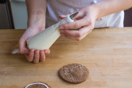 3. Using a different colour, pipe a swirl from the inside to the outside of the cookie.