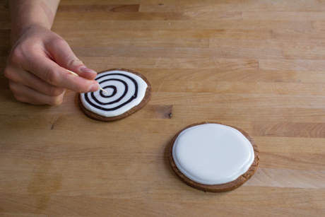 4. Working quickly, use a toothpick to draw lines from the centre of the cookie to the edge, creating a web-like design. Let set for at least 4 hours or overnight to allow icing to harden.