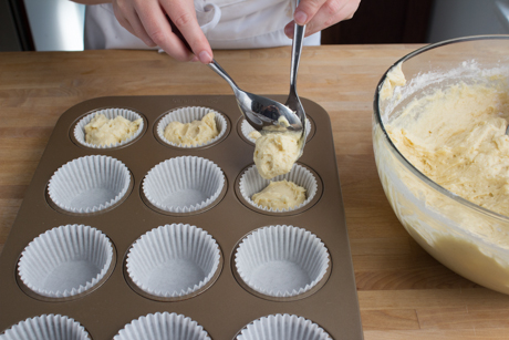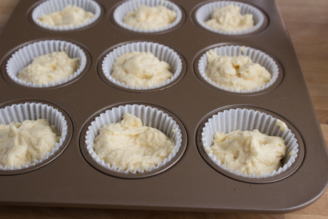 7. Fill cupcake liners 3/4 full, approximately 1/4 cup of batter for each cupcake.