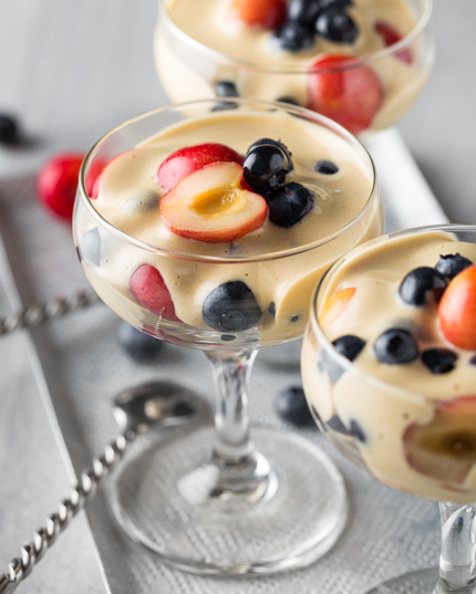 Top prepared fruit with warm zabaglione. Serve immediately.